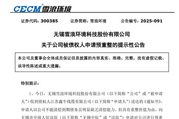 无锡雪浪环境科技股份有限公司(简称:雪浪环境)近日公告称,公司收到了债权人江苏鑫牛线缆有限公司(下称“申请人”)送达的《通知书》,申请人以公司不能清偿到期债务且明显缺乏清偿能力,但具有重整价值为由,向无锡市中级人民法院(下称“无锡中院”)申请对公司进行预重整。