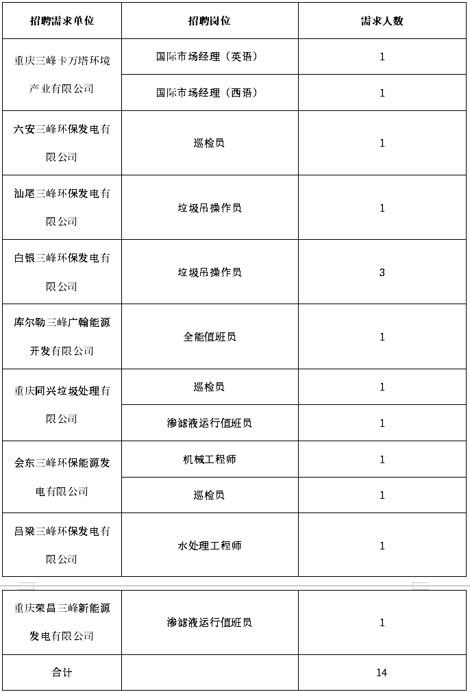 原标题:招聘丨重庆三峰环境集团股份有限公司招聘公告