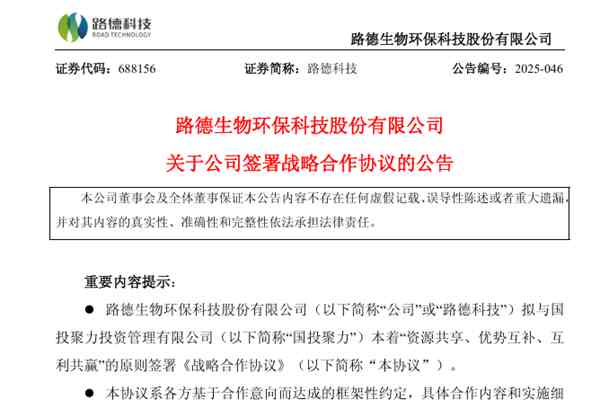 路德生物环保科技股份有限公司(简称:路德科技)近日公告称,公司拟与国投聚力投资管理有限公司(下称“国投聚力”)本着“资源共享、优势互补、互利共赢”的原则签署《战略合作协议》。