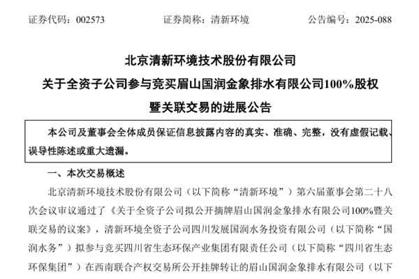 北京清新环境技术股份有限公司(简称:清新环境)公告称,12月17日,全资子公司四川发展国润水务投资有限公司(下称“国润水务”)与转让方签订了《产权交易合同》,次日,国润水务支付交易价款总额的50%,人民币2,810.00万元,同时取得了西南联合产权交易所出具的《产权交易凭证》。