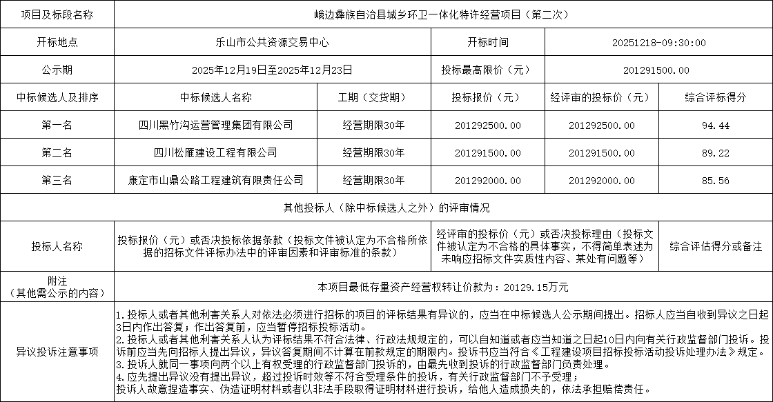 中标候选人第一名:四川黑竹沟运营管理集团有限公司,投标报价:201292500元;