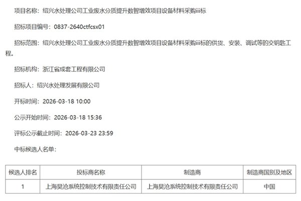 近日,上海昊沧系统控制技术有限责任公司成功中标“绍兴水处理公司工业废水分质提升数智增效项目设备材料采购III标”,中标金额超3000万元。