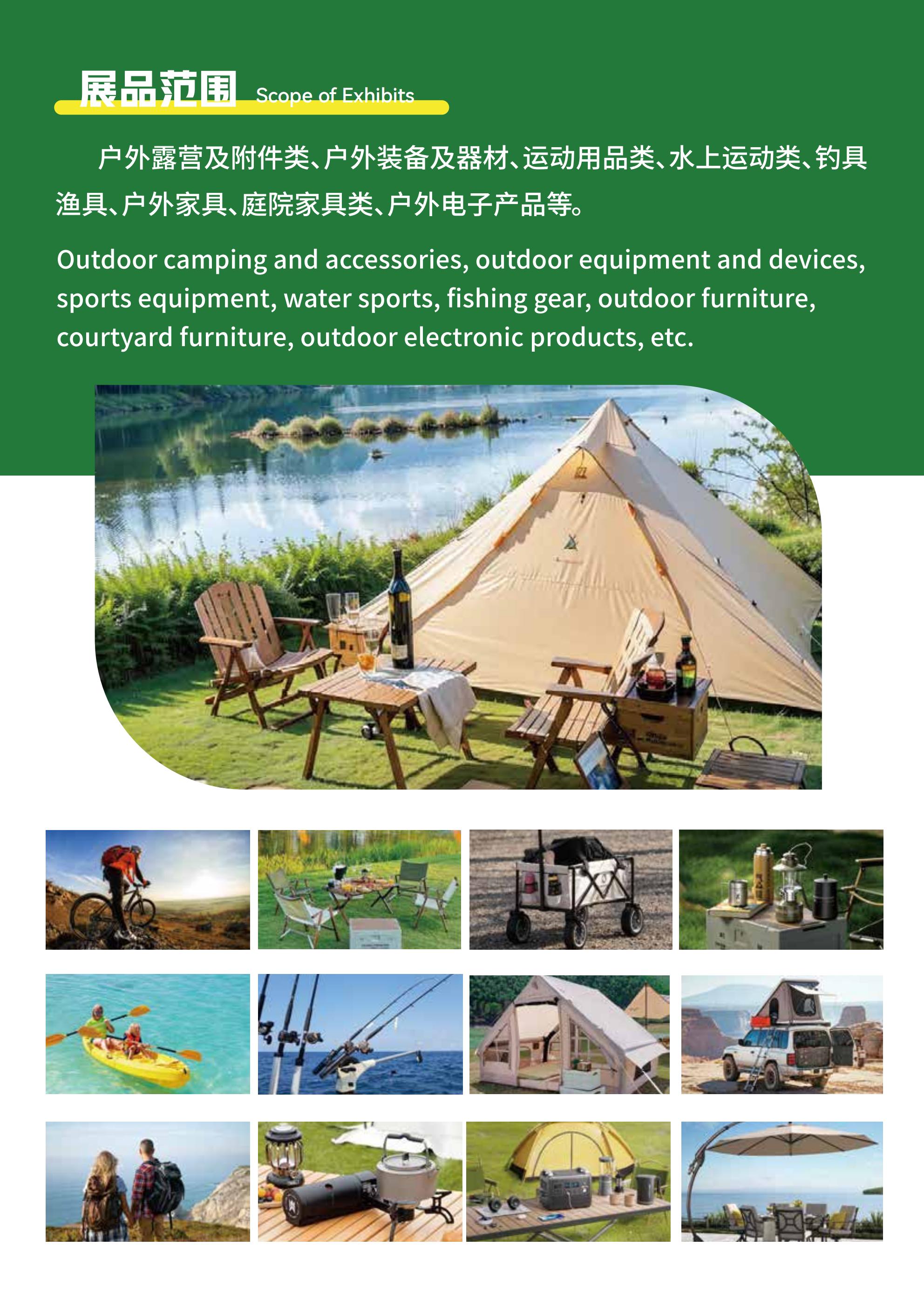 户外露营及附件类、户外装备及器材、运动用品类、水上运动类、钓具渔具、户外家具、庭院家具类、户外电子产品等。