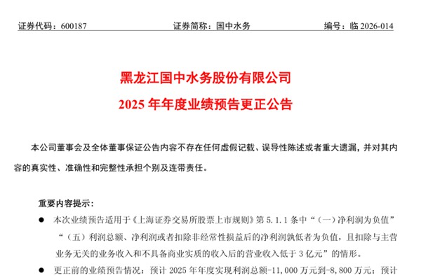 黑龙江国中水务股份有限公司(简称:国中水务)近日发布《2025年年度业绩预告更正公告》。
