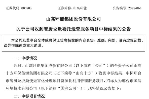 山高环能集团股份有限公司(简称:山高环能)近日公告称,全资子公司山高十方环保能源集团有限公司(下称“山高十方”)收到中标结果,中标邢台市餐厨垃圾粪便无害化处理项目资源化利用管理服务项目,招标人为邢台市国润环境技术有限公司(下称“国润公司”)。 项目详情 1、项目名称:邢台市餐厨垃圾粪...