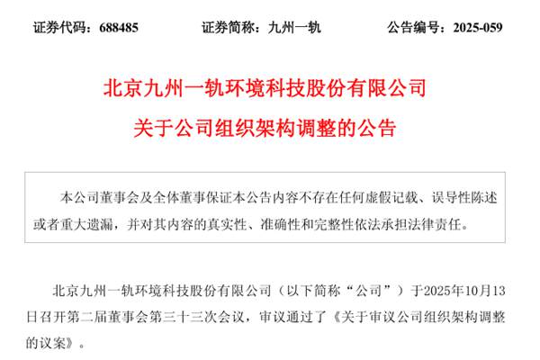 北京九州一轨环境科技股份有限公司(简称:九州一轨)近日公告称,结合公司战略规划与企业经营发展需要,为进一步完善治理结构,提升运营效率,公司拟对组织架构进行调整,将“环境振动综合控制事业部”更名为“声纹信息事业部”,主要负责声纹信息产品在轨道交通领域以外的大型综合基础设施的市场拓展,推动声...
