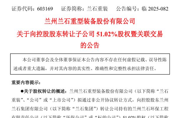 10月22日晚间, 兰州兰石重型装备股份有限公司(简称:兰石重装)发布公告称,公司拟通过非公开协议转让方式,向控股股东兰州兰石集团有限公司(下称“兰石集团”)转让公司持有的兰州兰石环保工程有限责任公司(下称“环保公司”)51.02%股权,本次交易价款总金额为1,439.08万元,转让完成...