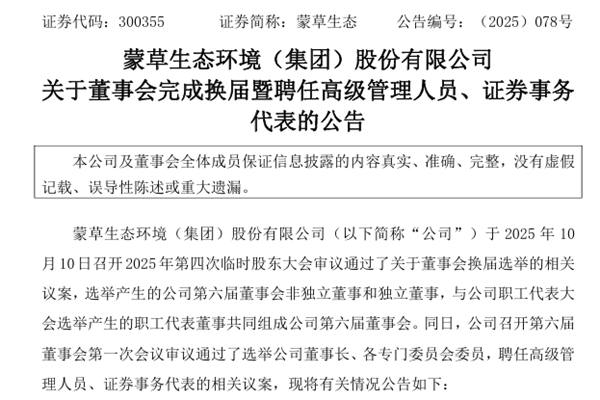 蒙草生态环境(集团)股份有限公司(简称:蒙草生态)公告称,公司于2025年10月10日召开2025年第四次临时股东大会、第六届董事会第一次会议,审议通过了关于董事会换届选举的相关议案以及选举公司董事长、各专门委员会委员,聘任高级管理人员、证券事务代表的相关议案等,详情如下↓ 一、第六届董事会及董事会各专门委员会组成情况 ...