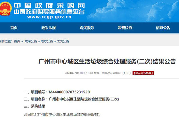 中国政府采购网消息称,广州市中心城区生活垃圾综合处理服务(二次)结果公告,2个包全部被广州环投永兴集团股份有限公司联合体拿下,清一色“广州环投”系。 项目编号:M4400000707523152D 项目名称:广州市中心城区生活垃圾综合处理服务(二次) 合同包1(广州市中心城区生活垃圾焚烧处理服务):2,0...