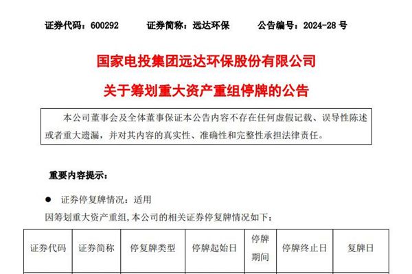 10月1日,A股上市环保国企国家电投集团远达环保股份有限公司(简称:远达环保)发布《关于筹划重大资产重组停牌的公告》,表示公司将于10月8日开市起继续停牌,预计停牌时间不超过 10 个交易日。 根据此前发布的《关于筹划重大资产重组事项的通知》,远达环保初步考虑通过发行 A 股股票或发行 A 股股票及支付现金购买中国电力国际发展有限公...
