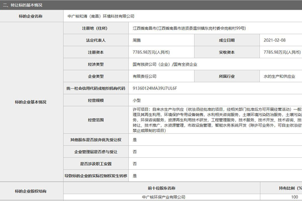 中广核和清(南昌)环境科技有限公司100%股权在北京产权交易所挂牌,中广核环保产业有限公司100%持股: 信息披露起始日期:2024-09-30 信息披露结束日期:2024-10-31 转让底价:7704.674201万元 注册资本:7785.98万元(人民币) 成立日期:2021-02-08 经济类型:国有独资公司(企业...