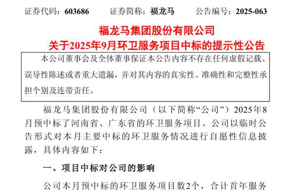 近日,福龙马集团股份有限公司(简称:福龙马)发布《关于2025年9月环卫服务项目中标的提示性公告》。公告显示,福龙马9月预中标的环卫服务项目数2个,合计首年服务费金额为1,347.56万元(占公司2024年度经审计营业收入的0.27%),合同总金额为2,196.92万元。 截至本公告披露日福龙马本年度环卫服务项目中标数28个,合计首...