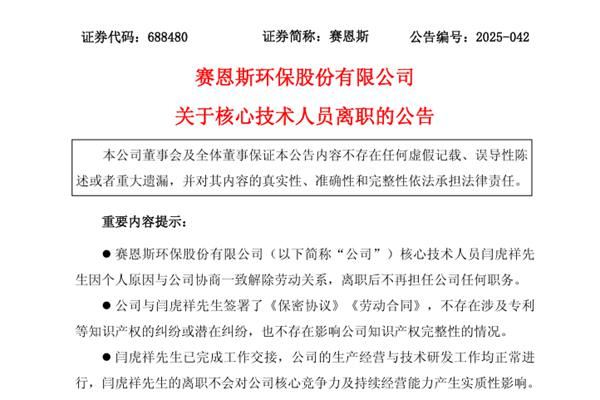 赛恩斯环保股份有限公司(简称:赛恩斯)近日公告称,公司核心技术人员闫虎祥先生因个人原因与公司协商一致解除劳动关系,离职后不再担任公司任何职务。目前,闫虎祥先生已完成工作交接,公司的生产经营与技术研发工作均正常进行,闫虎祥先生的离职不会对公司核心竞争力及持续经营能力产生实质性影响。 闫虎祥先生,2009年6月至2010年4月,任云南驰...