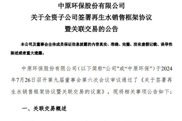 中原环保股份有限公司发布《关于全资子公司签署再生水销售框架协议暨关联交易的公告》,概况: 郑州新区污水处理厂“再生水+”综合智慧能源利用工程项目由公司全资子公司郑州市污水净化有 限公司投资建设,七里河堤里小清河连通综合利用水利工程项目由郑州水务集团有限公司投资建设,项目建成后,可以通过“再生水+&...