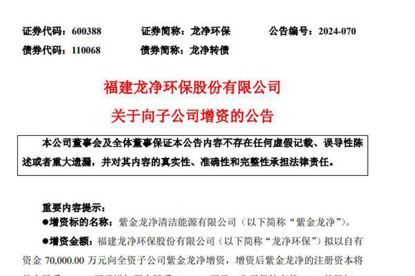 7月26日,福建龙净环保股份有限公司(简称:龙净环保)发布《关于向子公司增资的公告》。根据该公告,龙净环保将拟以自有资金 70,000.00 万元向全资子公司紫金龙净清洁能源有限公司(下称“紫金龙净”)增资,增资后紫金龙净的注册资本将从人民币 30,000 万元增加至人民币 100,000 万元,龙净环保仍持有...