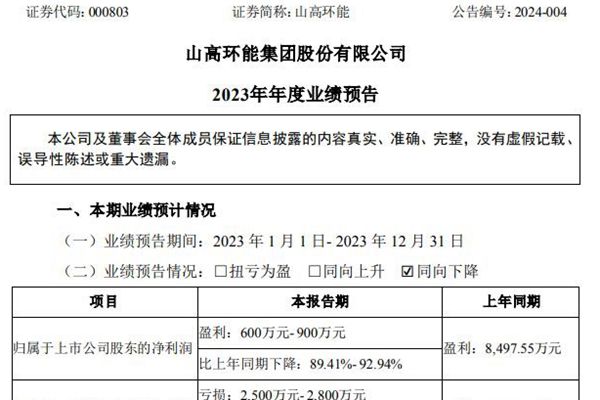 山高环能集团股份有限公司(简称:山高环能)近日发布《2023年年度业绩预告》,全年实现归属于上市公司股东的净利润盈利600万元-900万元,比上年同期下降89.41%- 92.94%;扣除非经常性损益后的净利润亏损2,500万元- 2,800万元,比上年同期下降131.49%-135.27%;基本每股收益盈利0.0129元/股- 0....