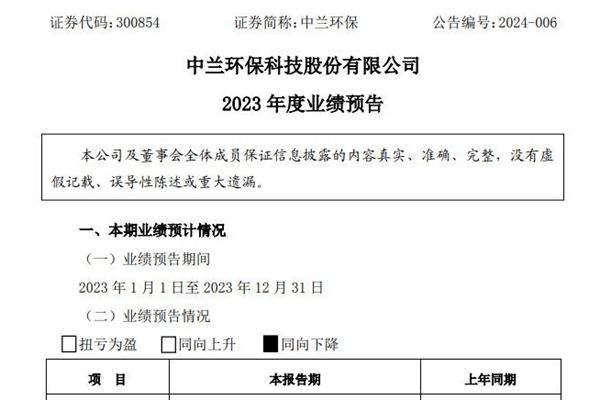 中兰环保科技股份有限公司(简称:中兰环保)近日发布《2023年度业绩预告》,实现归属于上市公司股东的净利润盈利1,200万元至1,800万元,比上年同期下降57.35%至36.02%;扣除非经常性损益后的净利润盈利1,670 万元至2,500万元,比上年同期下降66.06%至49.19%。 报告期内,中兰环保持有盐湖股份(SZ.00...