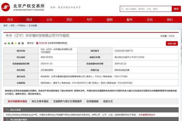 2024年1月23日,据北京产权交易所消息,中水(辽宁)水环境科技有限公司100%股权正在挂牌转让,转让底价4085万元,转让方为中国水利水电第六工程局有限公司。 公告显示,中水(辽宁)水环境科技有限公司成立于2020年3月17日,注册资本3114万元人民币,经营范围为水处理技术开发、技术咨询,污水处理项目建设、运营、管理,污水处理...