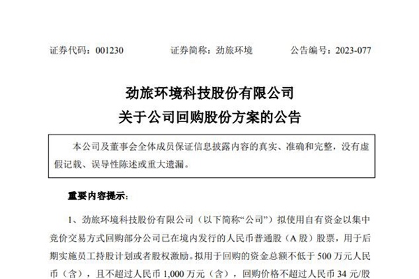 劲旅环境科技股份有限公司(简称:劲旅环境)12月20日晚间公告,公司拟使用自有资金通过集中竞价交易方式,以500万元至1000万元回购公司股份,用于员工持股计划或股权激励。回购价格不超过34元/股。 申明:本站发布此信息的目的在于传播更多信息,与本站立场无关。并且郑重提示所有阅读者,股市有风险,投资需谨慎,本文不作为任何投资的参考意...