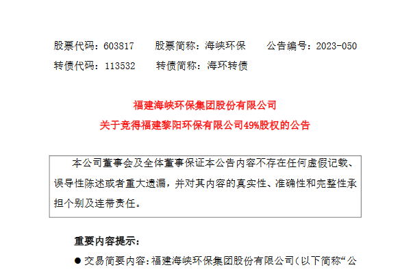 海峡环保近日发布公告称,公司以8,734.86万元的价格竞得中信环境技术(广州)有限公司持有的福建黎阳环保有限公司49%股权。 公告称,通过本次收购福建黎阳环保有限公司剩余股权,福建黎阳环保有限公司将成为公司全资子公司,有利于公司统筹管理,进一步提升管理决策效率,持续推进内部资源整合,实现公司资源的最有效配置,进一步巩固在水处理领域...
