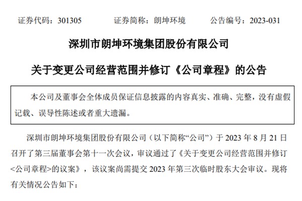 近日,深圳市朗坤环境集团股份有限公司(简称:朗坤环境)公告称,拟变更公司经营范围并修订《公司章程》。公告显示,朗坤环境经营项目将增加餐厨垃圾处理、生物基材料、成品油零售等,同时删去了政道路清扫保洁、生化污泥的资源化利用、污泥处理技术研究等。 具体如下图↓ 这样看来,朗坤环境或有意通过扩展餐厨垃圾处理业务,布局生物柴油市场...