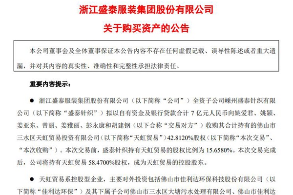 纺织业的巨头要收购环保企业? 2023年8月16日,浙江盛泰服装集团股份有限公司发布关于购买资产的公告,即拟以自有资金及银行贷款合计 7 亿元人民币收购佛山市三水区天虹贸易投资有限公司42.8120%股权,加上此前所持有的 15.6580%,交易完成后合计持有58.4700%股权,成为天虹贸易的控股股东。 公告称,天虹贸易系控股型...