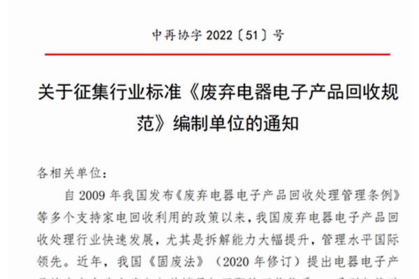 为整体提升废弃电器电子产品回收环节实力,助力企业顺利实现市场目标,中国再生资源回利用协会启动编制《废弃电器电子产品回收规范》行业标准,现就该标准征集编制单位。申请单位要求能够积极参与标准制修订的起草、调研、研讨会等惠东,并按时、保质完成标准编制的各项工作任务,申报单位愿意提供标准制定工作所需技术、人力和经费支持。...