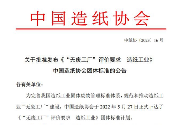 各有关单位: 为完善我国造纸工业固体废物管理标准体系,规范和推动造纸工业“无废工厂”建设,中国造纸协会于2022年5月27日正式下达了《“无废工厂”评价要求 造纸工业》团体标准计划。 根据《中国造纸协会团体标准管理办法》的规定,经标准调研、会议研讨、专家审查等程序通过,现批准发布《&...