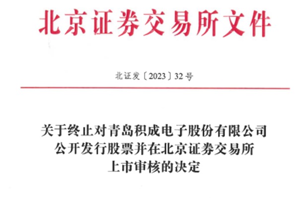 8月2日,中国水网从北交所获悉,北交所发布《关于终止对青岛积成电子股份有限公司公开发行股票并在北京证券交易所上市审核的决定》。 北交所于2021年6月21日受理了青岛积成提交的公开发行相关申请文件,并按照规定进行了审核。2023年7月24日,青岛积成向北交所提交了《青岛积成电子股份有限公司关于撤回向不特定合格投资者公开发行股票并在北...
