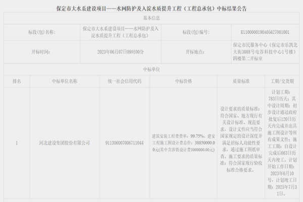 近日,中国水网从E20环境平台标讯采集系统E标通获悉,保定市大水系建设项目——水网防护及入淀水质提升工程(工程总承包)发布中标结果公告,河北建设集团股份有限公司联合河北建设集团生态环境有限公司、中国葛洲坝集团建设工程有限公司、中铁十八局集团有限公司、中国十七冶集团有限公司、中国中建设计研究院有限公司、黄河勘测规...