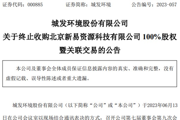 《年内最大并购引深交所发来关注函,城发环境近26亿投资更多细节待公开》一文发布不久,城发环境股份有限公司(简称:城发环境)收购北京新易资源科技有限公司(下称“北京新易”)100%股权事项就又传来了新消息。 城发环境公告称,由于相关事项需要进一步论证和完善,公司于2023年06月25日召开公司第七届董事会第十次...