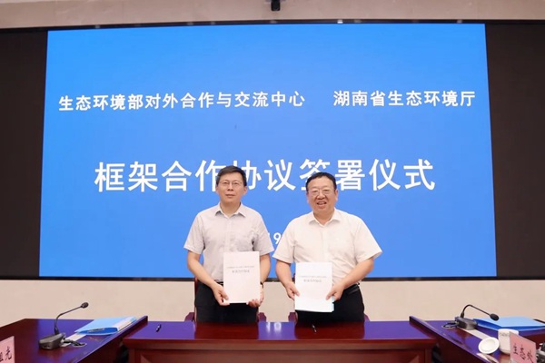 2023年6月19日,生态环境部对外合作与交流中心(以下简称“中心”)党委书记、主任张玉军一行来湘调研并召开座谈会,与湖南省生态环境厅签署合作框架协议。湖南省生态环境厅党组书记、厅长刘群出席。 张玉军介绍了中心职能和环境国际公约履约技术支撑、服务环境外交等工作情况。他表示,近年来,湖南以“守护好一...
