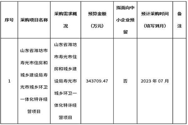 2023年6月16日,中国山东政府采购网发布“寿光市住房和城乡建设局2023年06月(至)07月政府采购意向”,内容为山东省潍坊市寿光市住房和城乡建设局寿光市城乡环卫一体化特许经营项目,预算金额343709.47万元,预计采购时间为7月。 原文如下↓ 寿光市住房和城乡建设局 2023年06(至)0...