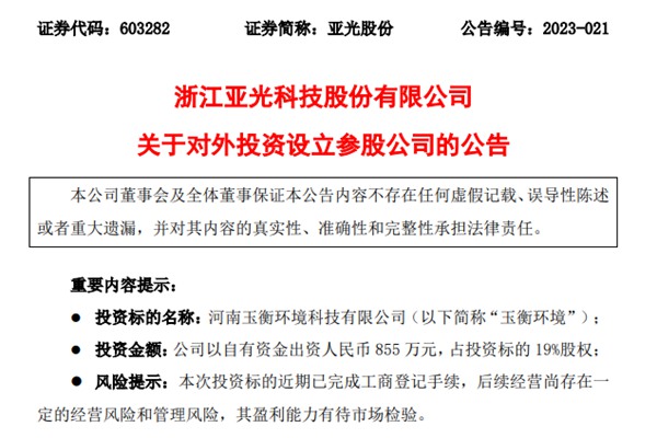 近日,浙江亚光科技股份有限公司(简称:亚光股份)发布“关于对外投资设立参股公司的公告”。公告显示,亚光股份拟以自有资金出资人民币855 万元参与设立河南玉衡环境科技有限公司(下称“玉衡环境”),股权占比19%。 按计划,玉衡环境注册资本将达到4500万元,经营范围为:【一般项目】碳减排...