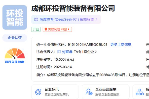 近日,成都环投智能装备有限公司成立,法定代表人为刘智睿,注册资本1亿元,经营范围: 【一般项目】环境保护专用设备销售;环境保护专用设备制造【分支机构经营】;通用设备制造(不含特种设备制造)【分支机构经营】;通用零部件制造【分支机构经营】;仪器仪表制造【分支机构经营】;新型膜材料制造【分支机构经营】;新能源原动设备制造【分支机构经营】...