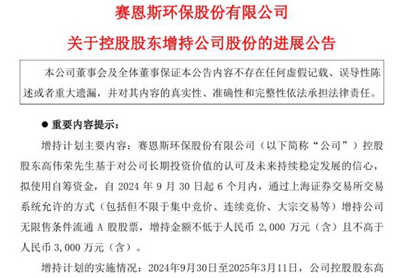 2025年3月12日,赛恩斯环保股份有限公司发布《关于控股股东增持公司股份的进展公告》。图源:赛恩斯公告 增持计划概述 增持主体:公司控股股东、董事长高伟荣先生 增持目的:基于对公司长期投资价值的认可及未来持续稳定发展的信心 增持方式:通过上海证券交易所...