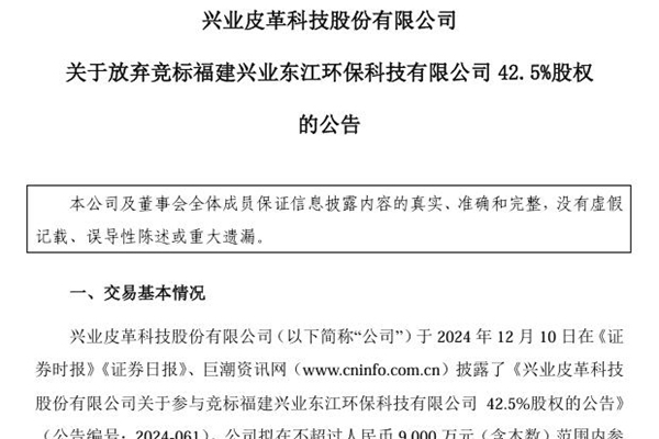 2025年01月04日, 兴业皮革科技股份有限公司发布《关于放弃竞标福建兴业东江环保科技有限公司42.5%股权的公告》。图源:兴业科技公告 公告表示,考虑到泉州地区危险废物处置的市场空间,以及公司未来发展战略,在综合各种因素的统筹规划后,经董事会研究决定,放弃参与竞标兴业东江环保42.5%股权。 公司放弃参与竞标兴业东江环保42....