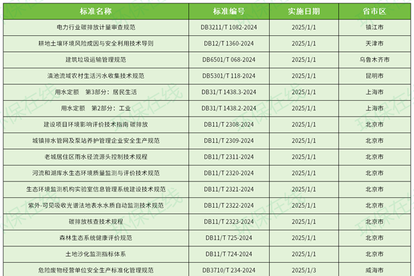 迈进2025年,环保人们,新实施的政策标准都看了吗→2025年1月1日,哪些环保政策标准来了? 站在2025年初,今天环保在线带来的是1月地方标准大合集↓:(仅供参考) 可以看到,自1月1日起,北京已经实施了一大批新的标准,包括《城镇排水管网及泵站养护管理企业安全生产规范》、《老城居住区雨水径流源头控制技术规程...