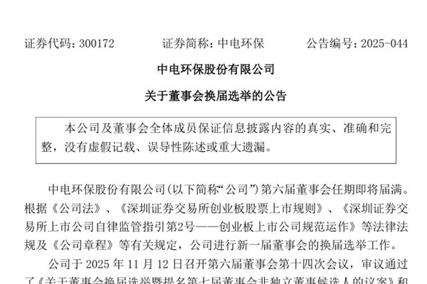 中电环保股份有限公司(简称:中电环保)于2025年11月9日召开第六届董事会第十四次会议,审议通过《关于董事会换届选举暨提名第七届董事会非独立董事候选人的议案》、《关于董事会换届选举暨提名第七届董事会独立董事候选人的议案》、《关于召开2025年第二次临时股东会的议案》等。 根据《公司章程》的规定,中电环保第七届董事会由8名董事组成,...