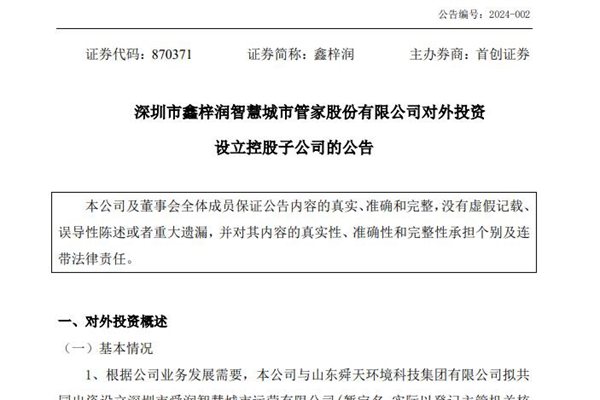 近日,深圳市鑫梓润智慧城市管家股份有限公司对外投资(简称:鑫梓润)发布公告称,将对外设立多家控股子公司,包括: ①与山东舜天环境科技集团有限公司共同出资设立深圳市舜润智慧城市运营有限公司(暂定名,实际以登记主管机关核准为准),注册资本为人民币 1,000,000 元,其中本公司以货币认缴出资人民币510,000 元,占注册资本的 5...