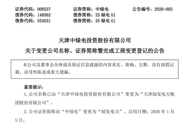 天津中绿电投资股份有限公司(简称:绿发电力)近日公告称,公司名称已由“天津中绿电投资股份有限公司”变更为“天津绿发电力集团股份有限公司”;证券简称由“中绿电”变更为“绿发电力”,启用日期:2026年1月5日;证券代码“00053...
