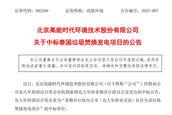 北京高能时代环境技术股份有限公司(简称:高能环境)近日公告称,公司控股孙公司北大年府清洁合资企业收到泰国北大年府亚穆乡行政办公室发出的中标公告,北大年府清洁合资企业为“亚穆乡行政办公室(北大年府亚灵县)社区生活垃圾焚烧发电项目”的中标单位。 1、项目名称:亚穆乡行政办公室(北大年府亚灵县)社区生活垃圾焚烧发电...