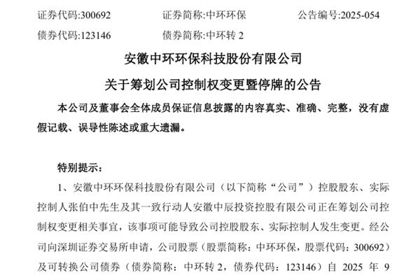 安徽中环环保科技股份有限公司(简称:中环环保)近日公告称,公司控股股东、实际控制人张伯中先生及其一致行动人安徽中辰投资控股有限公司正在筹划公司控制权变更相关事宜,该事项可能导致公司控股股东、实际控制人发生变更。经公司向深圳证券交易所申请,公司股票(股票简称:中环环保)及可转换公司债券(债券简称:中环转2)自2025年9月29日(星期一...