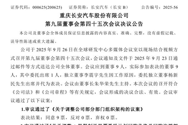 重庆长安汽车股份有限公司(简称:长安汽车)于2025年9月26日召开第九届董事会第四十五次会议,审议通过了《关于设立海外子公司的议案》、《关于长安汽车投资(深圳)有限公司设立飞行汽车合资公司的议案》等。接下来,长安汽车将设立海外子公司以及飞行汽车合资公司。 9月23日,长安汽车曾在投资者互动平台表示,公司将持续打造新技术,守护用户新...