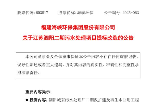 福建海峡环保集团股份有限公司(简称:海峡环保)近日公告称,控股子公司江苏泗阳海峡环保有限公司拟对泗阳城东污水处理厂二期改扩建及再生水回用工程项目进行提标改造,计划投资6,060.59万元(其中工程费用5,706.31万元)。 据介绍,此次改造包括:将原有V型滤池改造为反硝化滤池,增设提升水池、活性焦滤池、活性焦再生车间及辅助用房、出...