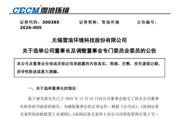 无锡雪浪环境科技股份有限公司(简称:雪浪环境)公告称,2026年1月12日,公司召开的第五届董事会第二十七次会议审议通过了《关于选举公司第五届董事会董事长的议案》,董事会同意选举蔡道远先生(简历详见附件)为公司董事长,任期自本次董事会审议通过之日起至第五届董事会任期届满之日止。 蔡道远先生,中国国籍,无境外永久居留权,1991年1月...
