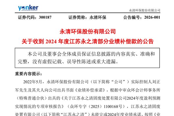 近日,永清环保股份有限公司(简称:永清环保)公告称,公司已收到2024年度江苏永之清固废处置有限公司(下称“江苏永之清”)部分业绩补偿款2600万元。此次补偿源于公司实控人刘正军及其夫人此前出具的业绩承诺,因江苏永之清未完成2024年度业绩目标,二人需向公司合计补偿7322.62万元。 公告披露,2022年5...