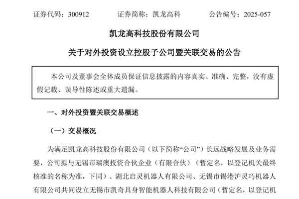 凯龙高科技股份有限公司(简称:凯龙高科)近日公告称,为满足公司长远战略发展及业务需要,公司拟与无锡市瑞澳投资合伙企业(有限合伙)(暂定名,以登记机关最终核准的名称为准,下同)、湖北启灵机器人有限公司、无锡市锡港沪灵巧机器人有限公司共同设立无锡市凯奇具身智能机器人科技有限公司(暂定名,以登记机关最终核准的名称为准,下称“凯奇...