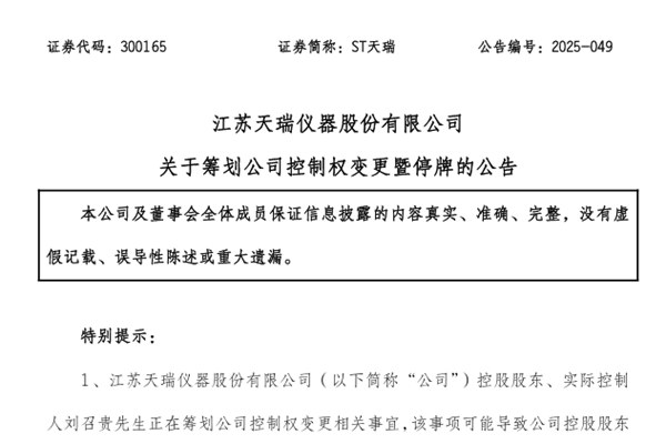 江苏天瑞仪器股份有限公司(简称:ST天瑞,下称“天瑞仪器”)近日公告称,公司控股股东、实际控制人刘召贵先生正在筹划公司控制权变更相关事宜,该事项可能导致公司控股股东及实际控制人发生变更。为保证公平信息披露,避免公司股价异常波动,维护广大投资者利益,经公司向深圳证券交易所申请,公司股票(股票简称:ST天瑞,股票代...