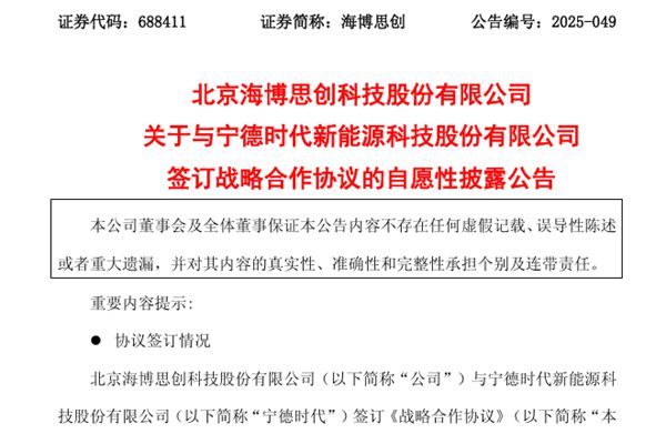 北京海博思创科技股份有限公司(简称:海博思创)近日公告称,公司与宁德时代新能源科技股份有限公司(下称“宁德时代”)签订《战略合作协议》(下称“本协议”),在2026年1月1日至2035年12月31日合作期内,双方应于每年度末(12月1日前)就未来三年的合作目标进行滚动式更新,并签署相应年...